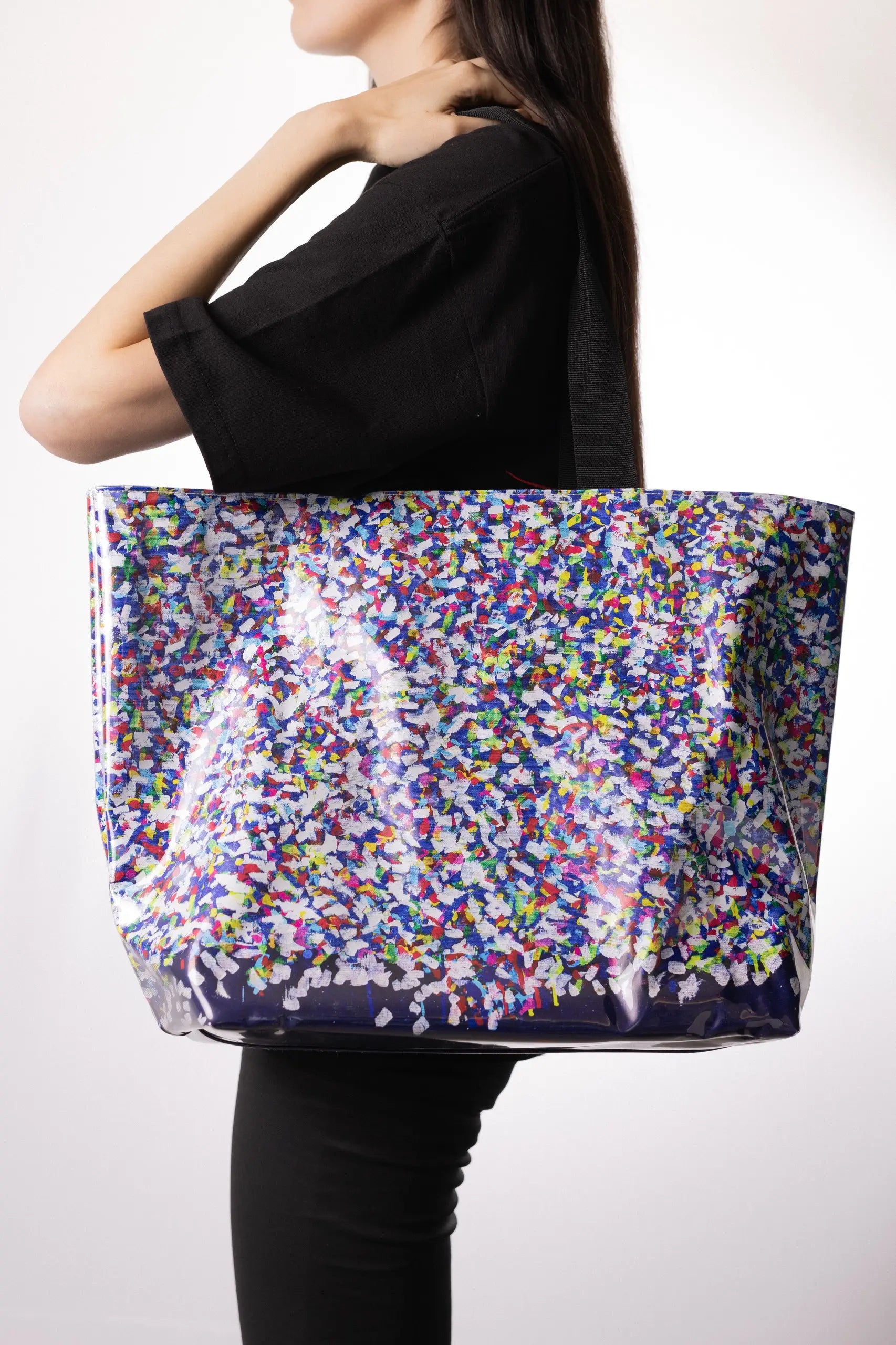 This bespoke tote bag incorporates the vibrant pattern and stencil-like lettering from one of Jonnie's paintings in his 'Death By Confetti' series.