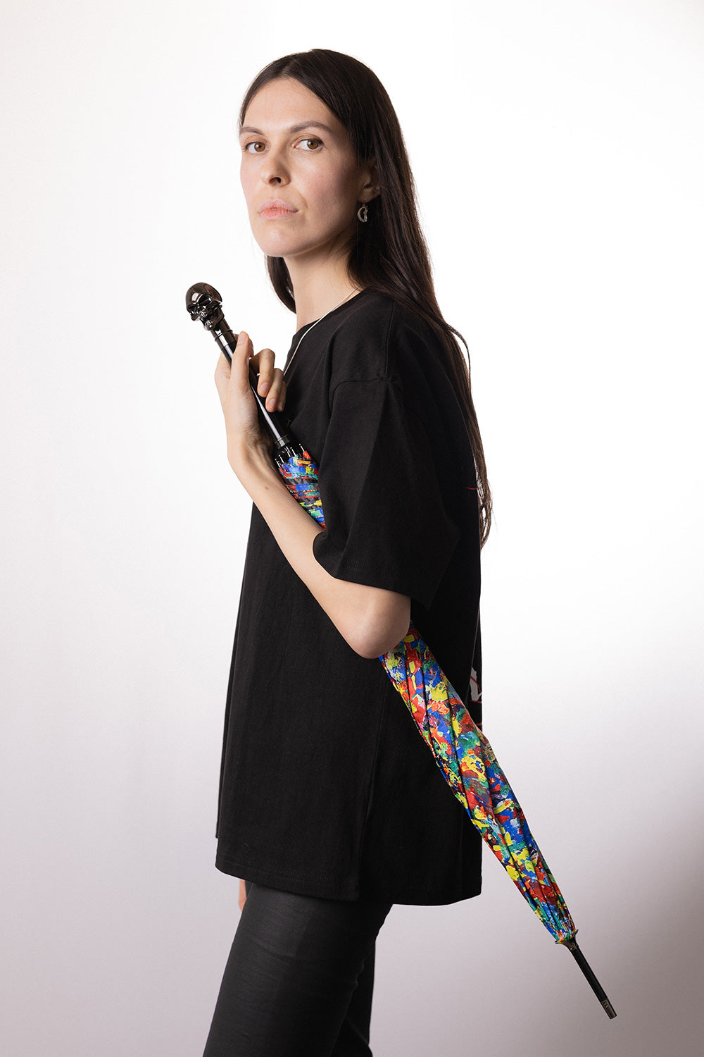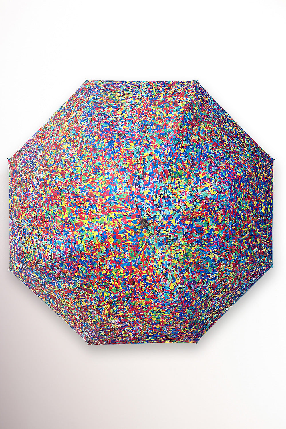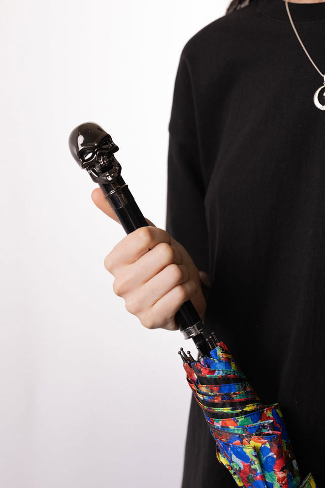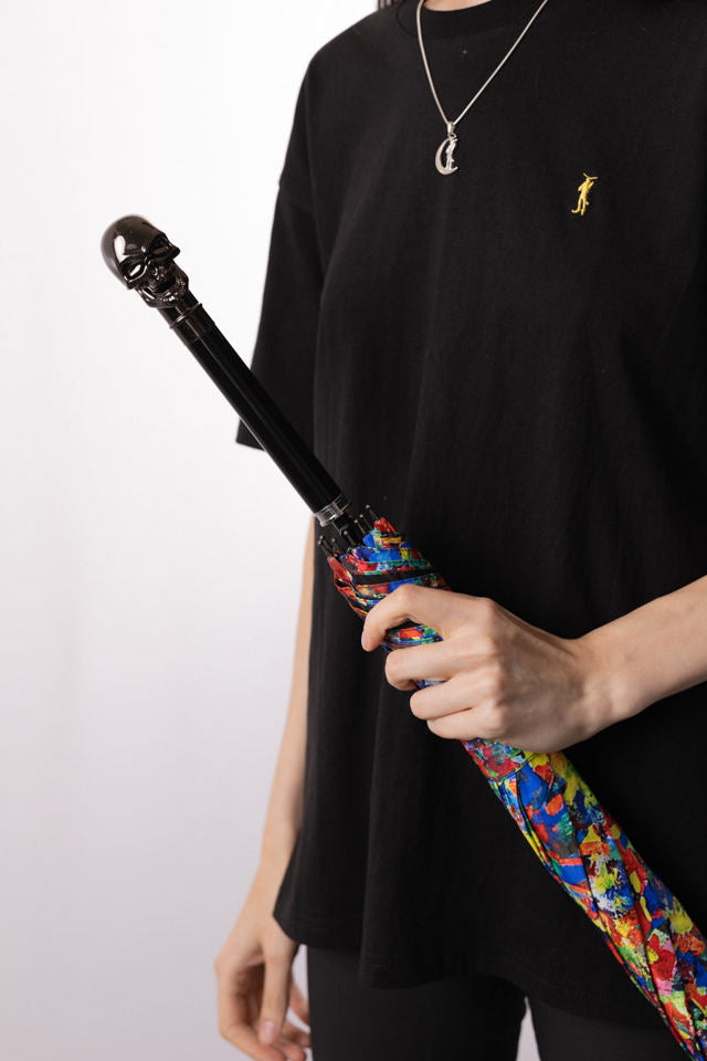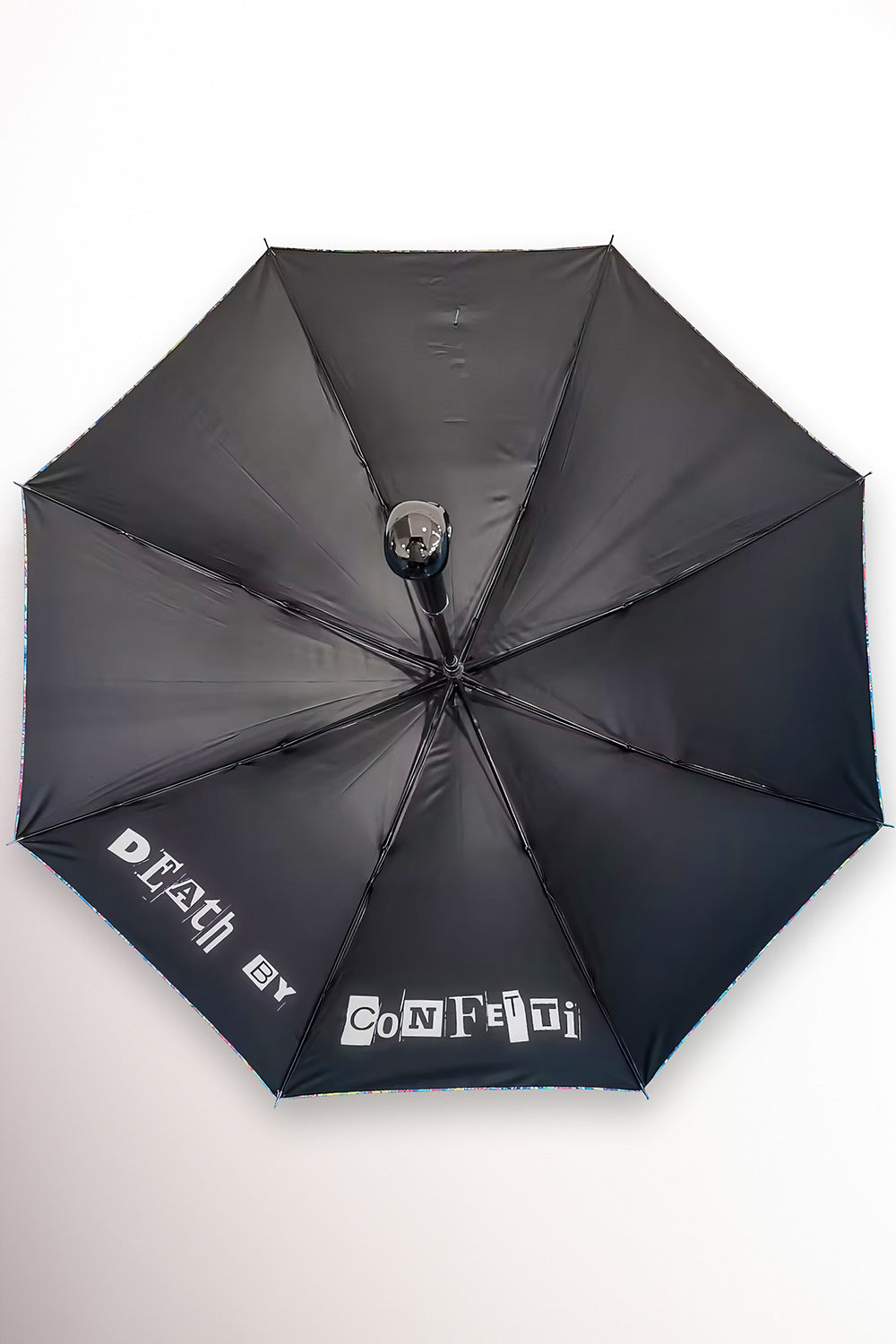 This umbrella, inspired by Johnny's "Death By Confetti," brightens up a gray, rainy day. The umbrella fabric features a psychedelic confetti print. The handle features a smiling metal skeleton and the words "Death by Confetti" on the inside. This sturdy, straight-cut umbrella features windproof construction and automatic opening and closing.